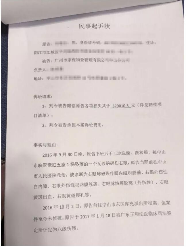 2016年9月30日晚,原告下班后在工地洗澡、洗衣服时,被映翠豪庭5座1梯坠落的一个瓦砂锅砸伤右眼,当即前往中山市人民医院救治,被诊断为右眼球破裂伴眼内组织脱垂、右眼外伤性白内障、右眼外伤性视网膜脱离、右眼黄斑出血等,于2017年1月18日被广东正和法医临床司法鉴定所评定为八级伤残。被告作为中山市映翠豪庭的管理人,对映翠豪庭5座1梯负有管理义务,被告有对房屋及配套设施和相关场地进行维修、养护、管理,维护相关区域的环境卫生和秩序的责任,但被告没有尽到其管理业务,应对原告所遭受的损失承担赔偿责任。